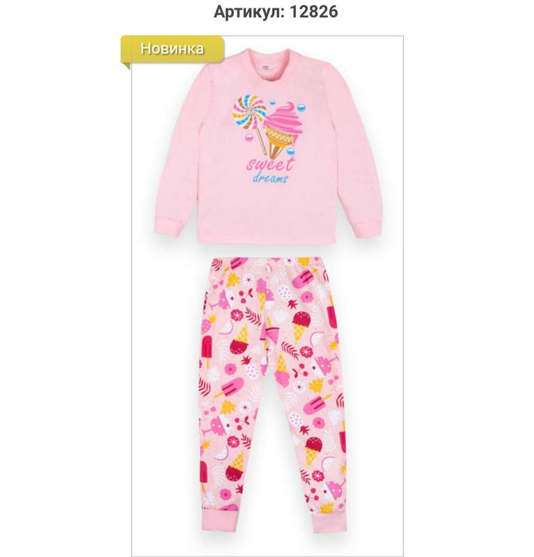 Є наложка 💗 Такая пижама подойдёт девочкам от 7-ми до 10-ти лет. Пижама *Sweet* состоит из футболки с длинным рукавом и штанов на эластичных89-63-91 манжетах. Футболка с длинным рукавом изготовлена из однотонных материалов пастельного оттенка. Дополняет изделие спереди очень сладкий рисунок - леденец на палочке и мороженое в рожке. Штанишки выполнены с удобной и глубокой посадкой, и также изготовлены из материала с набивным рисунком в виде сладостей и экзотических фруктов. Для изготовления пижамы для девочки PGD-21-9 *Sweet* была использована гиппоаллергенная ткань - кулир. Изделия из кулира практичны в использовании, и даже после многократных стирок сохраняют цвет и первоначальные свойства. Детская пижама для девочки *Sweet* есть в наличии 122, 128, 134, 140 размерах и в розовом цвете.