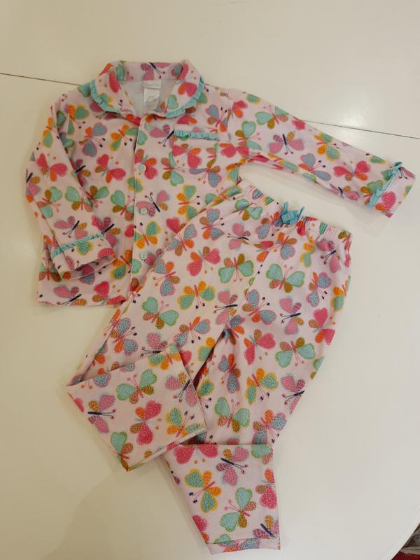 В очень хорошем состоянии байковая пижама на девочку 2-3года.Длина рубашки по спинке 37см, длина рукава с плечом 38см, ширина под мышками 31см. Длина штанины от пояса до низа 56см, длина от пояса до памперса 25см, длина шага 34см, талия 19см.