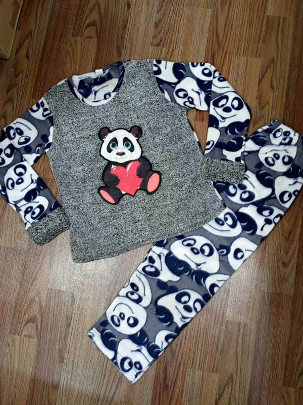 Пижама для девочек "Панда", 7-16лет. Флисовая пижама спереди и на рукавах махра, рисунок тканевый пришит. Флис не толстый . Состав: 95% cotton, 5% lycra. Производство: Турция. Размеры: 8, 10, 12, 14, 16. На возраст 7-16лет. При выборе размера ориентируйтесь на замеры изделия!!! Замеры: Размер 8: длина кофты 50см, длина рукава от плечевого шва 50см, ширина по линии груди 40см, длина штанов 75см, шаговая длина 49см, талия 26см тянется до 40см. Размер 10: длина кофты 53см, длина рукава от плечевого шва 51см, ширина по линии груди 42см, длина штанов 78см, шаговая длина 51см, талия 27см тянется до 43см. Размер 12: длина кофты 54см, длина рукава от плечевого шва 52см, ширина по линии груди 43см, длина штанов 82см, шаговая длина 54см, талия 27см тянется до 43см. Размер 14: длина кофты 57см, длина рукава от плечевого шва 53см, ширина по линии груди 44см, длина штанов 85см, шаговая длина 59см, талия 27см тянется до 43см.