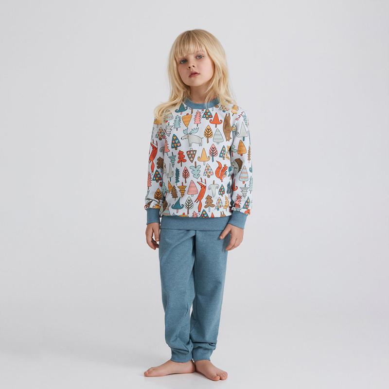 Домашний комплект для девочки от украинского бренда Ellen. В комплект входит принтованная футболка с длинным рукавом и однотонные брюки. Верх состоит из хлопка с добавлением эластана, а низ из хлопка с полиэстром и эластаном. Рукава и штанины на манжетах. Состав: 95% хлопок, 5% эластан/52% хлопок, 42% полиэстр, 6% эластан