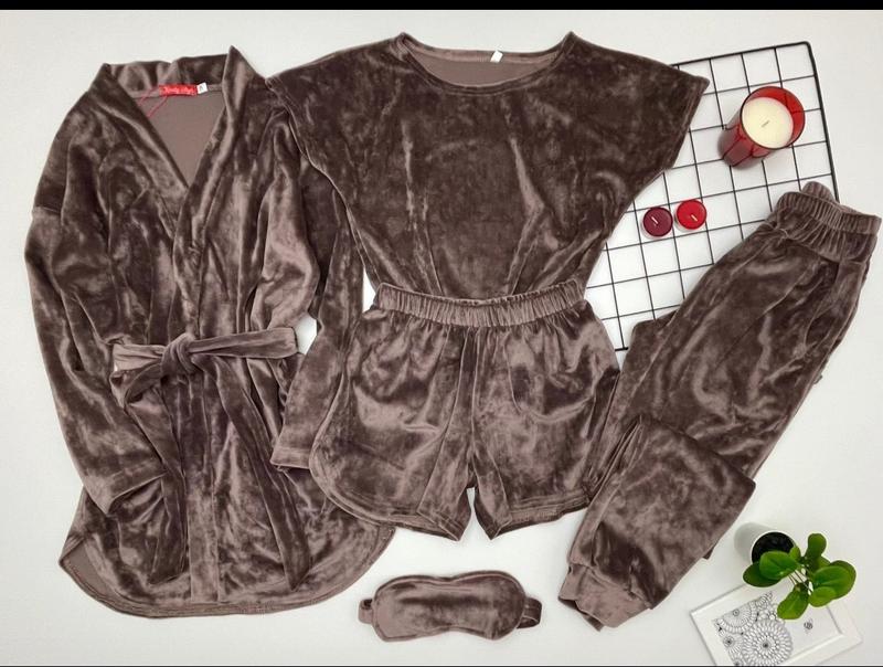 СУПЕР КОМПЛЕКТ! 🌷Велюровая пижама из 5 предметов -халат с поясом и карманами -футболка -шорты -штаны с карманами -маска на глаза 🌷ОТЛИЧНОЕ КАЧЕСТВО! цена 680грн размер/🌷дл.халата/пог/рукав от горловины/🌷дл.ф./пог/🌷дл.шорт/пот/🌷дл.штанов/шаг/пот/поб 134/🌷72/48/56/🌷51/41/🌷29/27/🌷86/66/26/48-2шт 140/🌷75/49/58/🌷52/41/🌷29/28/🌷88/67/27/49-2шт 146/🌷78/50/61/🌷53/42/🌷31/30/🌷92/70/29/50-1шт 152/🌷80/51/63/🌷56/42/🌷32/30/🌷95/72/29/51-2шт
