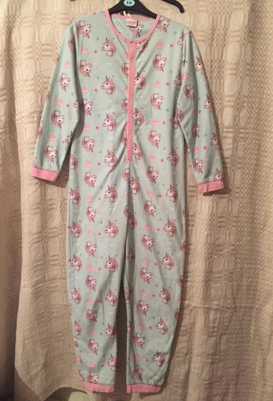 Тоненький флисовый кигуруми для девочки с принтом единорога на кнопках Пог-44,дл рук-53,дл-133,дл в шагу-63см