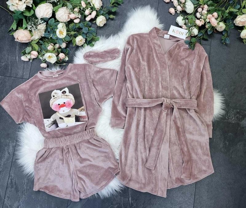 🎀Солодкі сни Гарантовано!💞 👑Чудовий зручний приємний до тіла домашній комплект з LALAFANFAN 👑 ❤️🔥В набор входить: 1️⃣Халат з поясом 2️⃣Футболка 3️⃣Шортики 4️⃣Маска для сну. 💚Тканина розкішний, мягкий, приємний до тіла віллюр плюш високої якості.👍🏻👍🏻👍🏻 💚Розміри: 140,146,152,158 Ціна 580 грн Замеры довжина халата/рукав від плеча/довжина футболки/пог/довжина шорт /поб/пояс 140 р-79\49\51\40\26\41\25 146 р-82\51\53\42\26\43\26 152 р-84\52\55\43\26\45\27 158 р-85\53\55\44\26\45\28