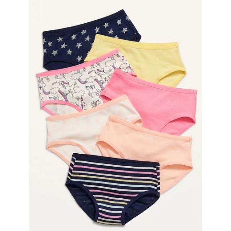 Набір трикотажних трусиків для дівчинки. В наборі 7 шт. М'які еластичні ґумки. Прикрашені принтом. Склад: 100% бавовна. Розмір Довжина Пояс 2-3 роки 18,5 см 20.5 см 4-5 років 19 см 24 см