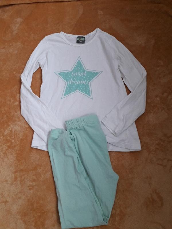 Пижамка Kids. Состояние отличное.Цвет белый и нежная бирюза, камера немного искажает Замеры: Реглан: длинна 50, пог 36. Лосины длинна 73, шаг 55, пот 25