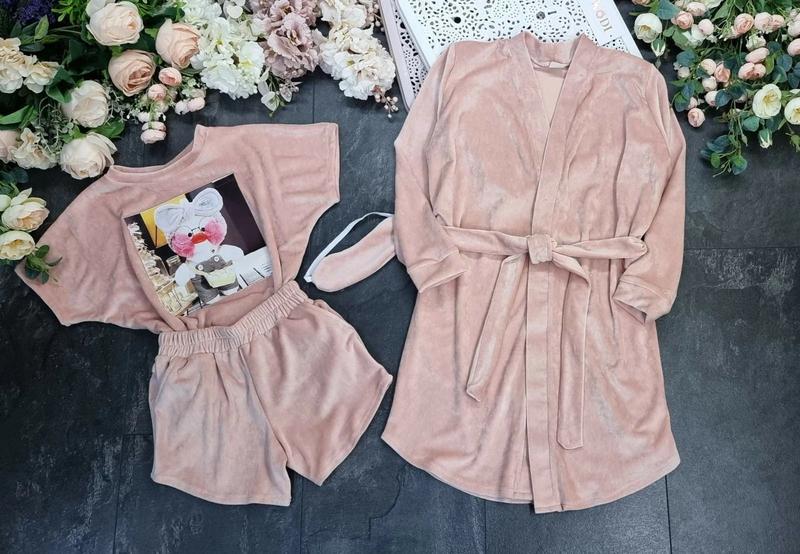 Крута велюрова піжама LALAFANFAN Халат+футболка+шорти +пов'язка Шорты з карманами Заміри :длина халата\длина рукава від плеча \длина футболки\ширина\длина шорт \бедра\пояс 140 р-79\49\51\40/26\41\25 146 р-82\51\53/42\26\43\26 152 р-84\52\55\43\26\45\27 158 р-85\53\55\44\\26\45\28