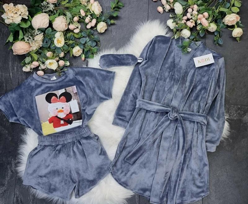 Крута велюрова піжама LALAFANFAN Халат+футболка+шорти +пов'язка Шорты з карманами Заміри :длина халата\длина рукава від плеча \длина футболки\ширина\длина шорт \бедра\пояс 140 р-79\49\51\40/26\41\25 146 р-82\51\53/42\26\43\26 152 р-84\52\55\43\26\45\27 158 р-85\53\55\44\\26\45\28
