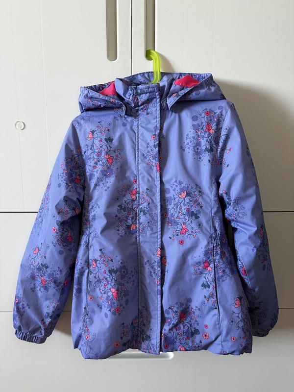 Плащик з підкладкою на дівчинку 128 см, підійде на осінь-весну. Є дефект - маленька плямка від фарби на тій частині рукава, що повернута до тіла. Капюшон відстібається.
