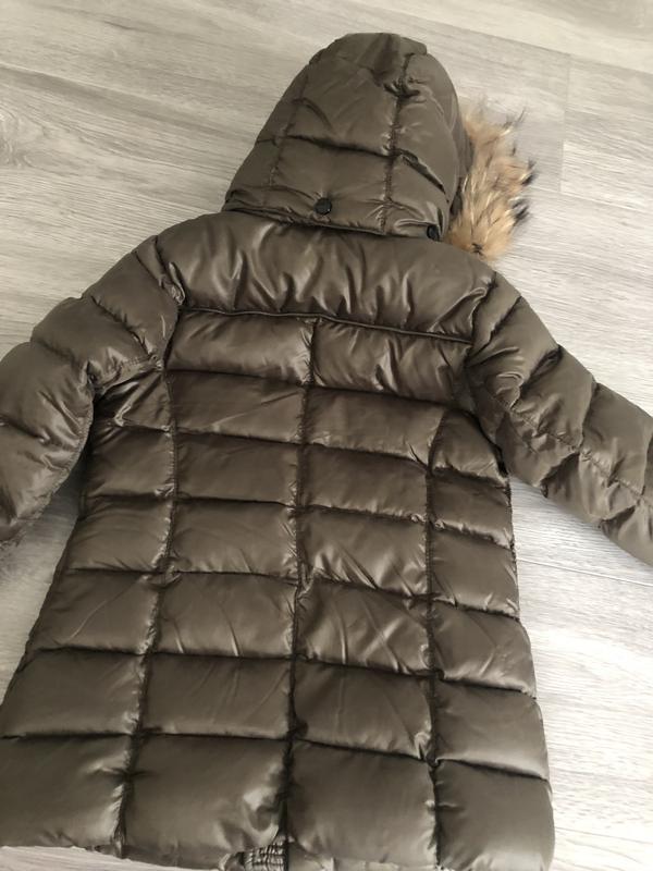 Тепленький пуховик для девочки на 4 года темно зеленого цвета. Натуральный мех на капишоне, единственный нюанс в садочку ребенок оторвала петельку чтобы вешать следует красиво пришить