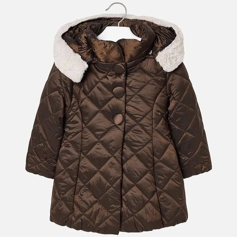 Детское пальто Mayoral для девочки: Капюшон с искусственным мехом, съемный Застёгивается на молнию и кнопки по всей длине Средняя длина С карманами. В наличии размеры 104см, 110см, 116см, 122см, 134см.