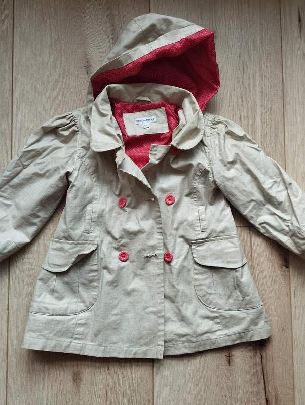 Дуже прктичний та гарний плащ-дощовик Marks & Spencer autograph на вік 4-5 р. (можна і на 6 р.). Дуже гарний стан, яскрава підкладка та гудзики, кишені на липучках, капішон можна відчіпається. Може бути як плащ на весну або на прогулянку в дощову погоду як дощовик. Вдягнений кілька разів. Заміри: довжина 50 см, рукав 32, ширина в поясі 33 см.