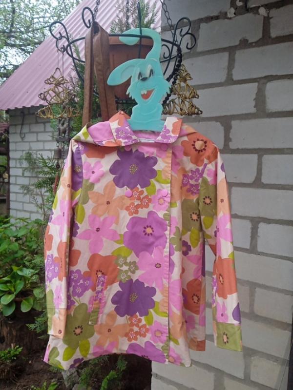 6-7р, на подкладке, длина 55, пог 40, плечи 33, рукав 42, на кнопках вверх 4шт, глубокий капишон, карманы боковые, фасон свободный, типа разлетайка, стан хорош без нюансов, яркий насыщенный цвет, защита от дождя и ветра