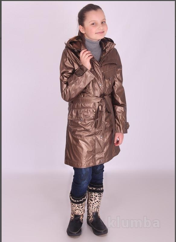 Плащ в идеальном состоянии близкок к новому. Состав: верх: 100% полиэстер/подкладка: 100% хлопок Цвет: Бронзовый. Страна производства: Китай Плащ демисезонный для девочки; наружный материал полиэстер (100%), тонкая внутренняя подкладка (хлопок 100%); дополнительные -утяжки на капюшоне капюшон на заклепках отстёгивается. 2 бигунка на змейке. 1 минус заводской брак нижняя кнопка не рабочая.