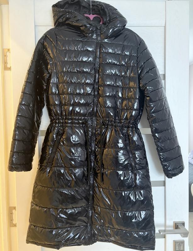 Плащ на підкладці, на тонкому синтепоні, лаковий. Розмір 164см, можна на xs-s. В талії регулюється. Новий!