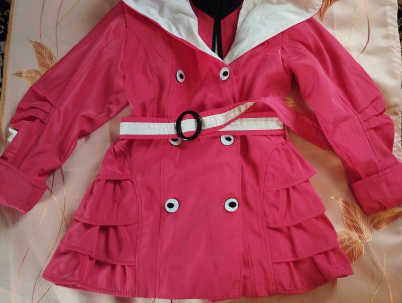 Праздничный плащик-тренч для девочки 122 см. в идеальном состоянии (стан нового, одет несколько раз). Очень красивого кораллового цвета в сочетании с молочным. Очень качественная и приятная на ощупь ткань. На подкладке, спереди внутри укорененная частичка на замке, а снаружи застегивается на пуговицы. С капишоном Декорировано рюшамт по бокам и бантом на поясе сзади.