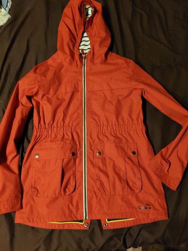 в отличном состоянии, плащевка, спинка утепленная хб. очень красивая и удобная. капишон глубокий на резинке.замеры запить.
