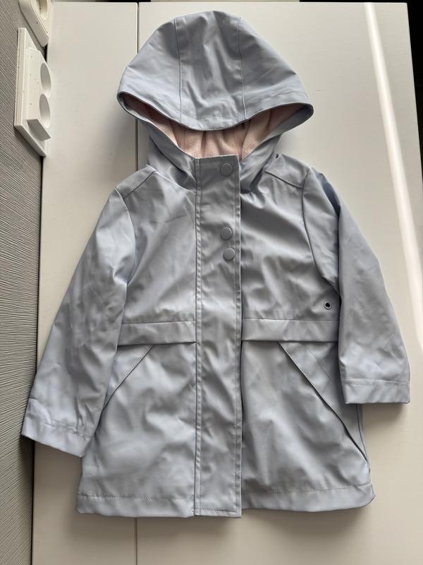Дитячий утеплений плащ на флісі, розмір 92. Світло блакитний колір, водонепроникний матеріал. Гарний широкий капюшон. Довжина 43 см Довжина рукава 20 см Напів обʼєм грудей 30 см