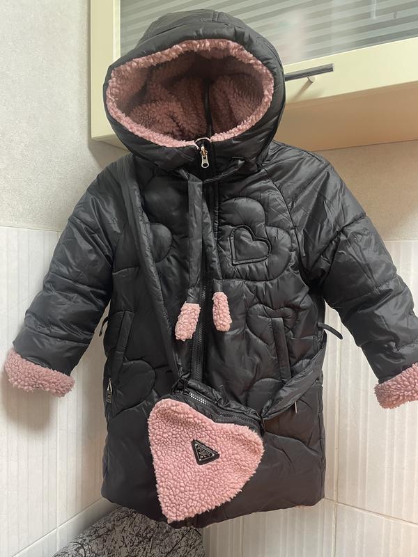 Двохстороння курточка , з однієї сторони якісна плащівка з іншого боку теплючий тедді, в чудовому стані ,в комплекті сумочка у вигляді сердечка на блискавці яка чудово довершує образ, ваша малеча буде задоволена 🌺
