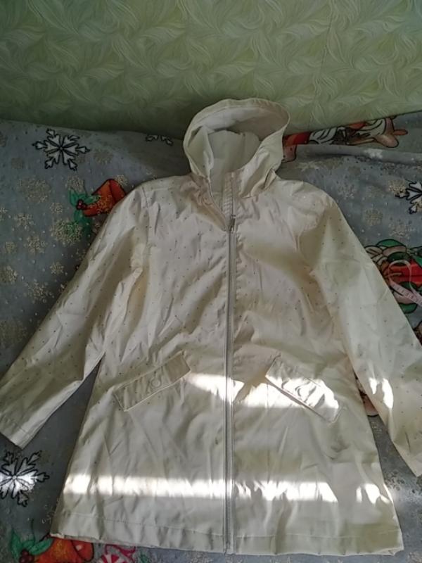 фирменный плащ, плотный на подкладке, цвет молочный сыкрапками блесиучими э дефекты на крайных фото может отобретись рукава 52, длина 69 плечи37