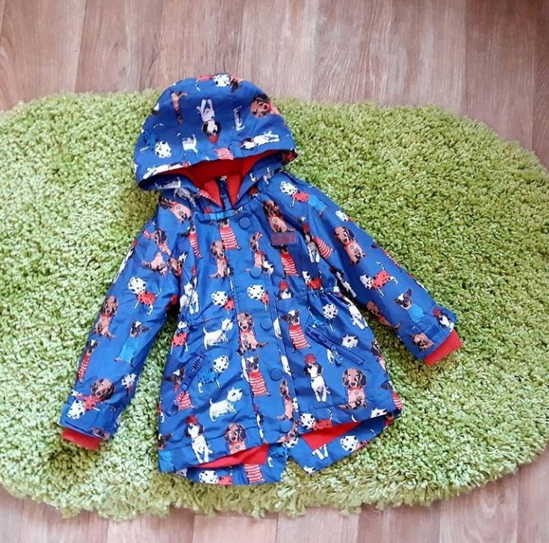 Очень красивая яркая и качественная ветровка на флисе фирмы Next для девочки. Размер указан 1,5-2 года на рост 92 см,большемерит! Есть такая больше ( 2-3 года). Сезон:тёплая весна-теплая осень. Снаружи водоотталкивающая ткань, подкладка флис. Застёгивается высоко под шею, есть трикотажный воротник,чтоб не задувал ветер и не натирало шею,карманы на молниях,есть трикотажные манжеты. Сзади по центру спинки на резиночке,за счет чего очень красиво смотрится на ребенке. Сзади немного удлинена. Состояние новой, без следов носки. Замеры: Длина от плеча до низа 40/45 Ширина под ручками 33 Рукав от плеча 34 плюс манжет Плечи 28