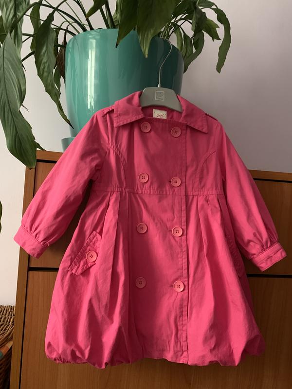 Бавовняний плащик від New look для дівчинки, з підкладкою. Застібка на ґудзики., пишний низ, призібраний по низу. Стан гарний, без дефектів. Рукав 30,5см., довжина по спинці 52см.