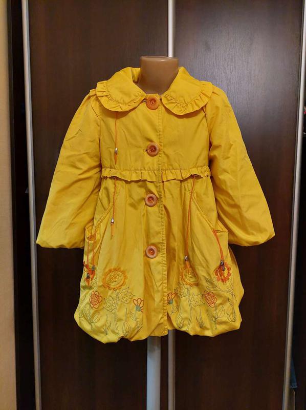 Плащ жёлтого цвета для девочки на возраст 3,5-5 лет с вышивкой по низу. Плащ застёгивается на пуговицы, капюшон на пуговках можно отстегнуть, есть воротник. Длина плаща 59-60 см, ширина 34, длина рукава 40 см. Пересылаю.