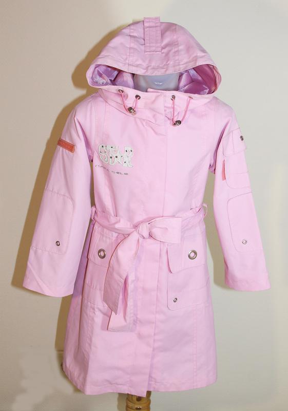 Плащ для девочки Выполнен из качественной барьерной ткани. Прямой фасон. На молнии и кнопках, под поясок. Материал: плотная плащевка Цвет розовый Размер 104, 110, 116