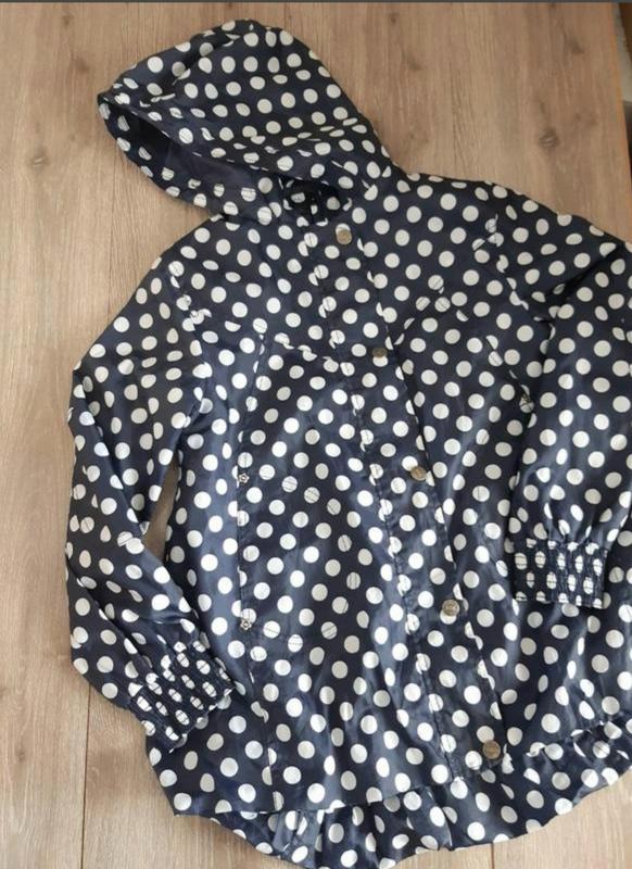 Ветровка с капюшоном синяя в белый горох.2 кармана спереди.Фасон трапеция, по низу присобрано. Длина 66-74 ПОГ 46 ПО бедер 58 Плечи 38 рукав 56
