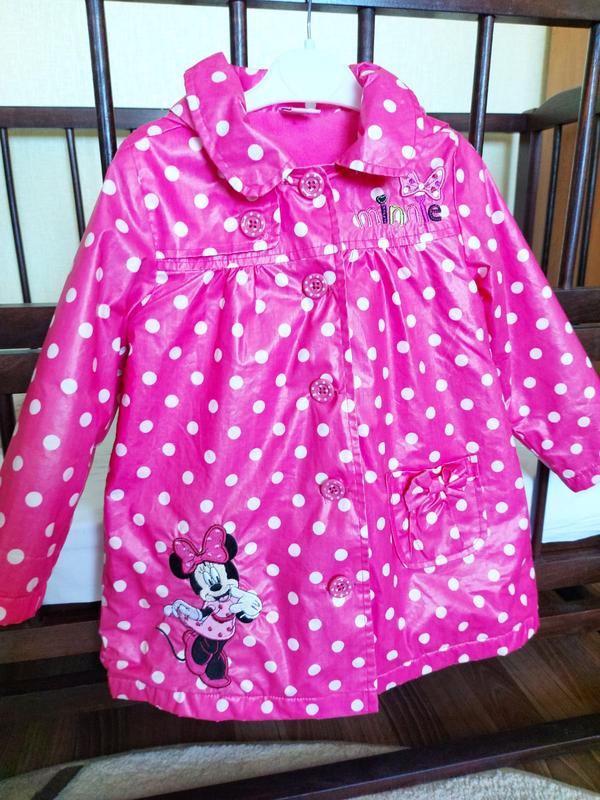 Яркий дощовик з цупкої тканини на флісі, підійде на осінь і весну. Для дівчинки 3-4 років. Заміри на фото. Довжина 51 см. Нюанс - є плтертості на рукавах