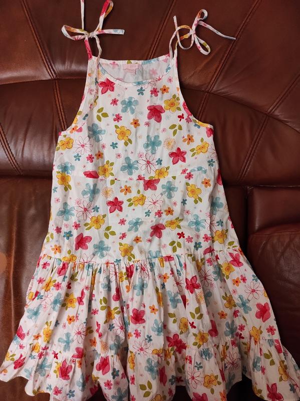 из натурального хлопка средней плотности, милая расцветка в цветочек, без подкладки - ткань не светится, не прозрачная. Длина от плеча 82 см, ПОГ 38 см, ПОТ 42 см, ПОБ 47 см. На плечах завязки