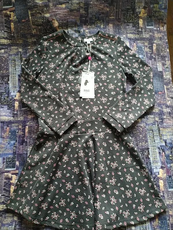 Сукня з заниженою талією, застібається на гудзик, темно сірого кольору в рожево білі квіточки, горловина призібрана, на плечах золотисті вставки, рукав на тонкому манжеті, тканина не тонка. Вказаний розмір 8/9 зріст 134. Склад 95 поліестер 5 еластан. Заміри довжина 70, рукав 47.5, нот 33.5
