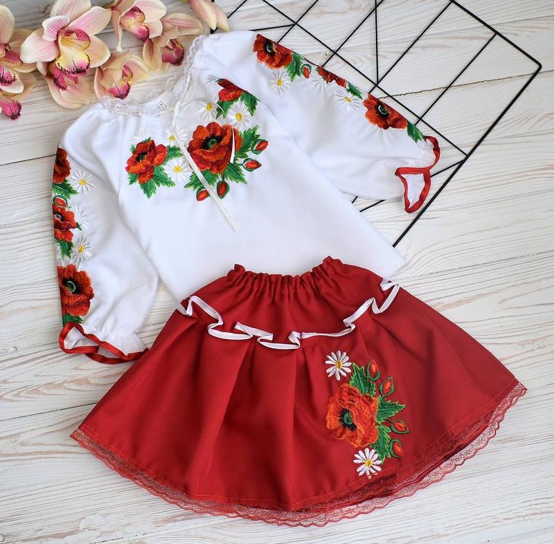 ✅Тка-на: Габардин ✅Додатково: машинна вишивка. ✅ЗВЕРТАЄМО УВАГУ НА ЗАМІРИ! ✅Заміри: блуза довжина/ширина/рукав від горловини, спідничка довжина 2(92)-бл 40/30/34, сп 26 4(104)-бл 43/33/39, сп 31 6(116)-бл 44/35/42, сп 33 8(128)-бл 48/37/48, сп 36 10(140)-бл 49/39/51, сп 43 ✅Можлива похибка у вимірах +- 1/2 див. обов'язково огляд на поштою.