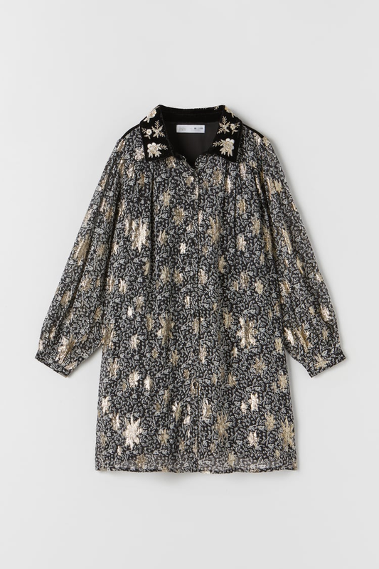 СУКНЯ-СОРОЧКА З КОНТРАСТНИМ ОКСАМИТОВИМ КОМІРОМ І ДОВГИМИ РУКАВАМИ. ЗАСТІБАЄТЬСЯ НА ҐУДЗИКИ СПЕРЕДУ. ВИШИТІ КВІТИ З БЛИСКУЧИМ МЕТАЛІЗОВАНИМ ЕФЕКТОМ ПО ВСІЙ ПОВЕРХНІ. Розмір 11-12 років (152 см) Склад: 90% ВІСКОЗА · 10% ПОЛІЕСТЕР