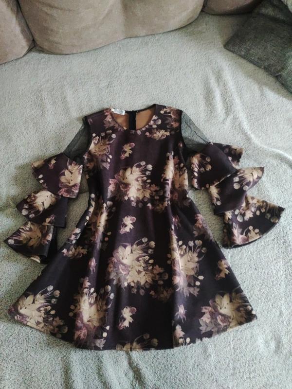 Сукня зі штучної замші з прозорими вставками, стан ідеальний, розмір 146-158. Крій вільний, ярусний рукав. Заміри: довжина 75, плечі 34, пог 41, рукав 51