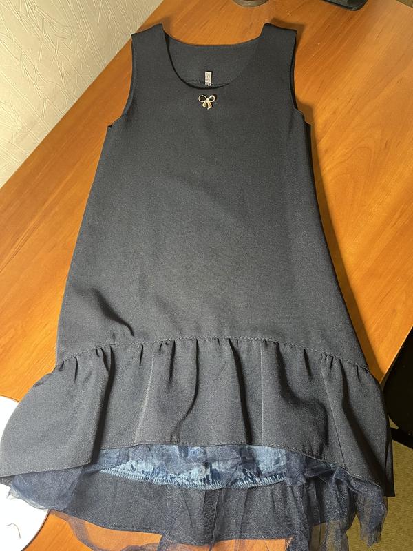 Дуже гарний шкільний сарафан, в ідеальному стані. Тканина - костюмка Внизу є фантін синього кольору. Колір сарафану - темно-синій Дитина носила в 1-2 класі Заміри Довжина зпереді - 56 см Довжина ззаду- 65 см Напівохват грудей -30 см