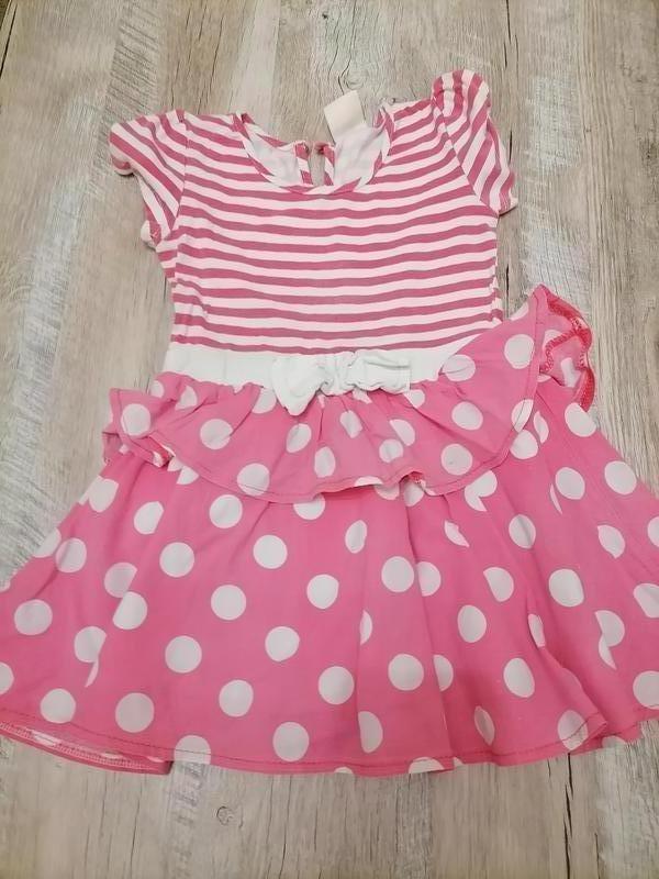 Плаття рожеве у полоску з горошками на вік 3 4 роки ріст 98/104 см матеріал коттон 100%. Довжина 52 см. у поясі 27 см. із нюансів на поясі є маленька жовта плямка виводити не пробувала