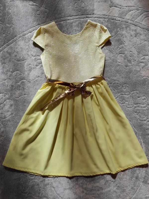 Півобхват грудей - 31 см Півобхват талії - 29 см Ширина плечей - 28 см Довжина рукава від плеча - 7,5 см Довжина від талії до низу - 42 см Довжина виробу - 66 см Стан нової. На спинці оригінальний виріз, пояс золотого кольору, ззаду блискавка. Дівчинка у цій сукні виглядає вишукано та елегантно!