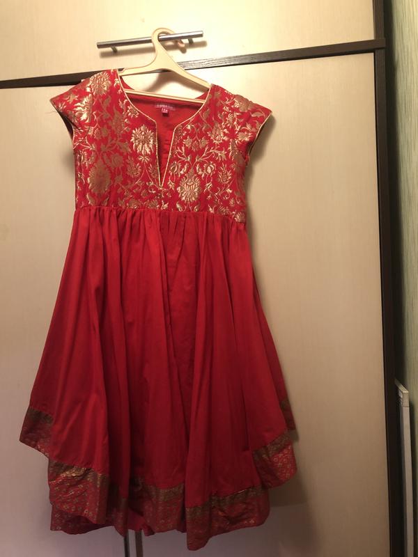 Плаття клеш, тканина 100% хлопок, дуже стильне та гарне. Його довжина 80 см, по талії 34 см, від підмишок до підмишок 34 см, розмір 8-9 років. Збоку є блискавка. Зверху вишите золотими нитками. Одягали декілька разів.