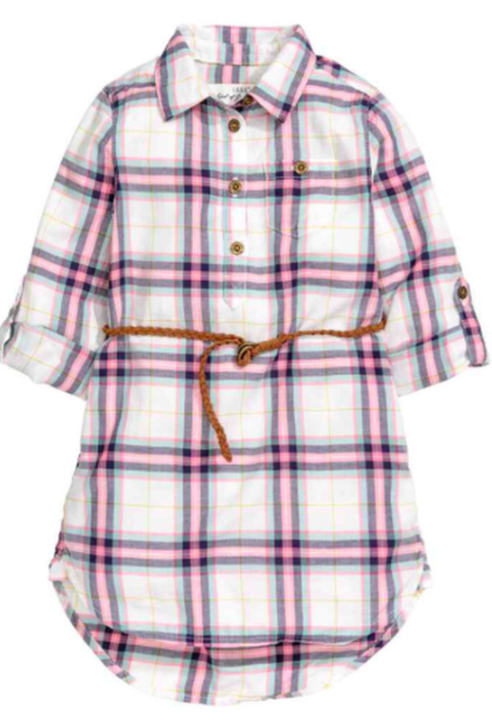 Платье из хлопковой ткани с плетеным поясом в комплекте. На платье воротник и застежка сверху. Нагрудный карман на пуговице и боковые карманы. Длинные рукава с застежкой снизу, а также хлястиком на пуговице. Скругленный нижний край, спинка немного удлиннена. Размеры: 104, 122 см