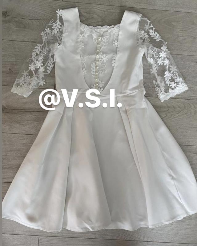 Фото на тілі нема Воротник квадратний Рукави трьохчертвертні Рукави і вставки з ніжної тканини з вишивкою (узори квітів) Спідниця трапеція Застібається збоку на молнію Є ґудзики круглі перламутрові Не тягнеться Плотность середня Сукня підійде на 7-9 років оріентуйтесь по замірам З нюансів-знизу є пятно на фото вказано Нюанс у ціні враховано Колір білий айворі Сукню можна вдягати ґудзиками ззаді або на перед Довжина 74 см) Плечі 27 см) Рукав 34 см) Пог 32,5 см) Пот 31 см) Поб 50-60 см) Знизу 106-107 см)