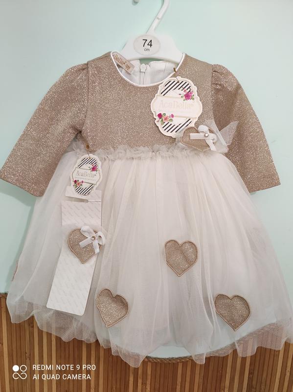 Красиве нарядне плаття для дівчинки золотого кольору на довгий рукав. Низ пишний шар молочного фатіну оздоблений золотими сердечками. Підкладка з натуральної бавовни. В наборі шпилька до волосся.
