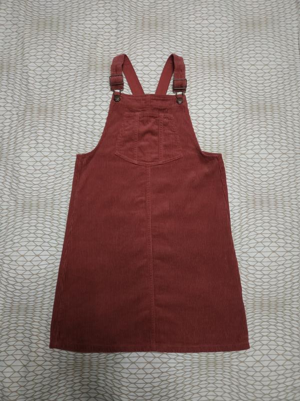 Длина 78см, подмышками 39 см, в поясе 41 см, бедра 43 см, бретели регулируются, есть карман, цвет таракотовый, вельвет.