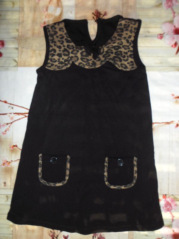 Леопардовий сарафан, розмір на бірці 4-5., матеріал віскоза довжина 55 см. ширина 28 см Стан відмінний, дефектів немає. Сарафанчик дуже стильний. Зручно з гольфиком або регланчиком