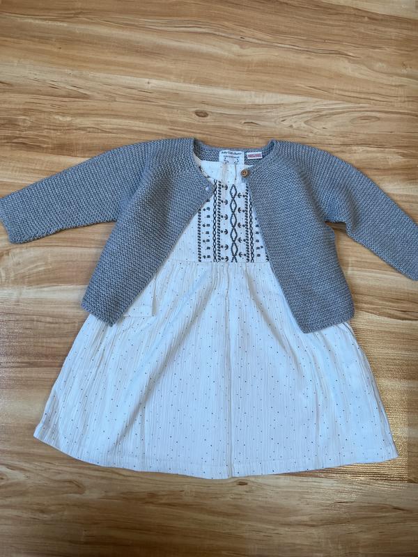 Плаття від французького бренду Du pareil,оздоблене вишивкою, тканина бавовна жатка, має підкладку. На етикетці вказано, що на вік 2 рочки, ріст 92см. Накидка від Zara на вік 9-12 міс. Ми так підбирали і одівали. Стан ідеальний.