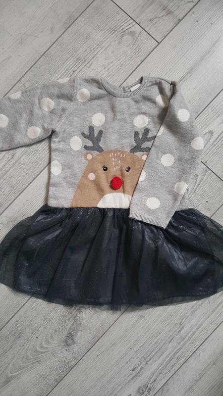 Теплое вязаное платье туника H&M. Снизу блестящая юбка из фатина, спереди яркий рисунок оленёнок. Размер указан 12-18, но большемерит. Состояние новой вещи, одевали 1 раз для фото.