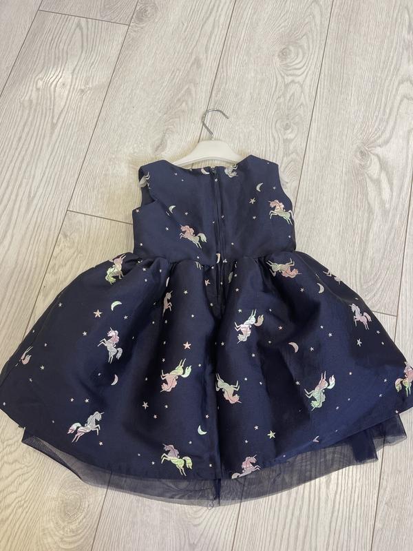 Святкова сукня для дівчинки. На зріст 92см. Довжина виробу 47см, півобхват талії 27см. Дуже гарна сукня з однорогами. Трохи пишна. Якісна. Виробник H&M. Вдягали на свята пару раз. Стан ідеальний. Колір темно-синій.