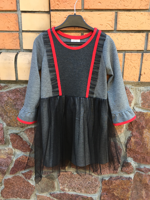 Дуже оригінальне #плаття з #трикотажа і #фатіна. Трикотаж середньої щільності, приємний до тіла, 100% віскоза. Обхват грудей 32 см, ширина плеча 25 см, довжина рукава 35 см, довжина 60 см. До плаття входить зразок тканини. Плаття в одному єкземплярі.