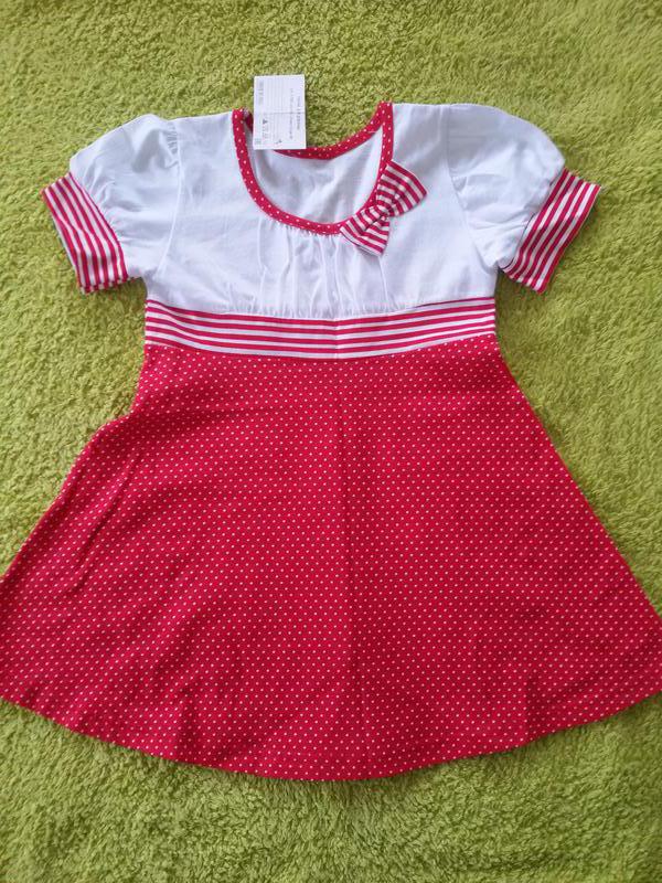Продам новое милое платьице на девочку, рост 98см, состав - 100% хлопок, привезено из Беларуси. Рукава "фонарики", декорировано бантиком. Замеры: Длина - 50см, Ширина под руками - 27см.
