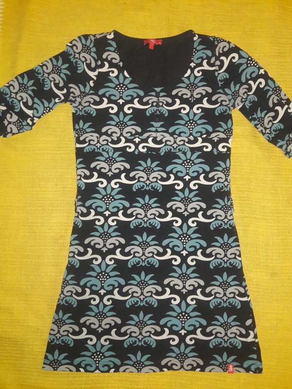 Платье,цвет синий + абстрактн ый рисунок.Приятный мягкий то нкий плотный стрейч трикотаж. Смотрится стильно дорого и симпатично.Кокетка с 3 пугови цами для декора,обтянуты этой же тканью и вышивка логотип бренда.Ниже планочка.Спинка все так же,только без пуговиц. Силуэт слегка к низу трапецией и логотип.Длина 81см,плечи 30 см,грудь 39см,низ 49см,рукав 3/4 35см.Сделано Германия. Если надо еще фото - дошлю.