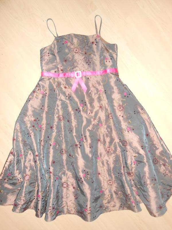 Пышное блестящее платье с вышивкой и пайетками на 7-9 лет. Пышное и классное, пошито из переливающейся ткани, украшенной вышивкой и пайетками. Застежка - молния на спинке до талии, где есть поясочек для утяжки. Замеры по требованию.